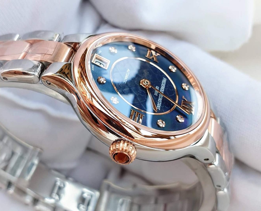Đồng hồ nữ FC Automatic FC-306NHD3ER2B dial màu xanh nổi bật, độc đáo, cọc số kim cương sang chảnh, được trang bị bộ máy FC-306 Automatic, tần số dao động 28800 vph, 25 chân kính, thời gian trữ cót lên đến 42h. Vỏ được làm bằng thép chống gỉ cao cấp 316L và mạ vàng hồng rose gold rất đẹp. -Kim, cọc số cũng được thiết kế với tông màu rose gold rất hòa quyện với màu viền vỏ của đồng hồ. Mặt kính được làm bằng sapphire nguyên khối chống xước tốt. Caseback lộ máy. Dây được làm bằng thép chống gỉ cao cấp 316L và mạ vàng hồng