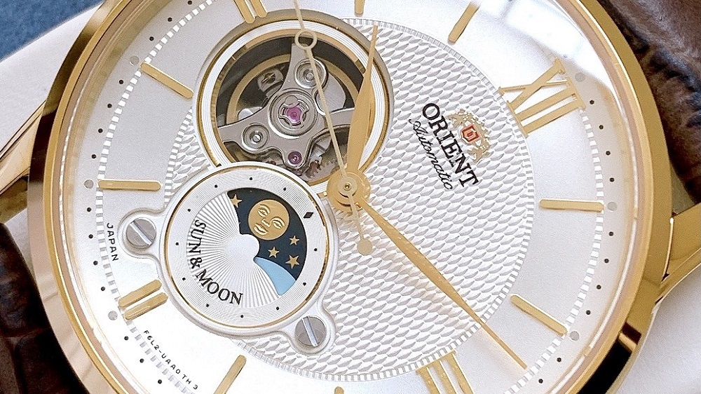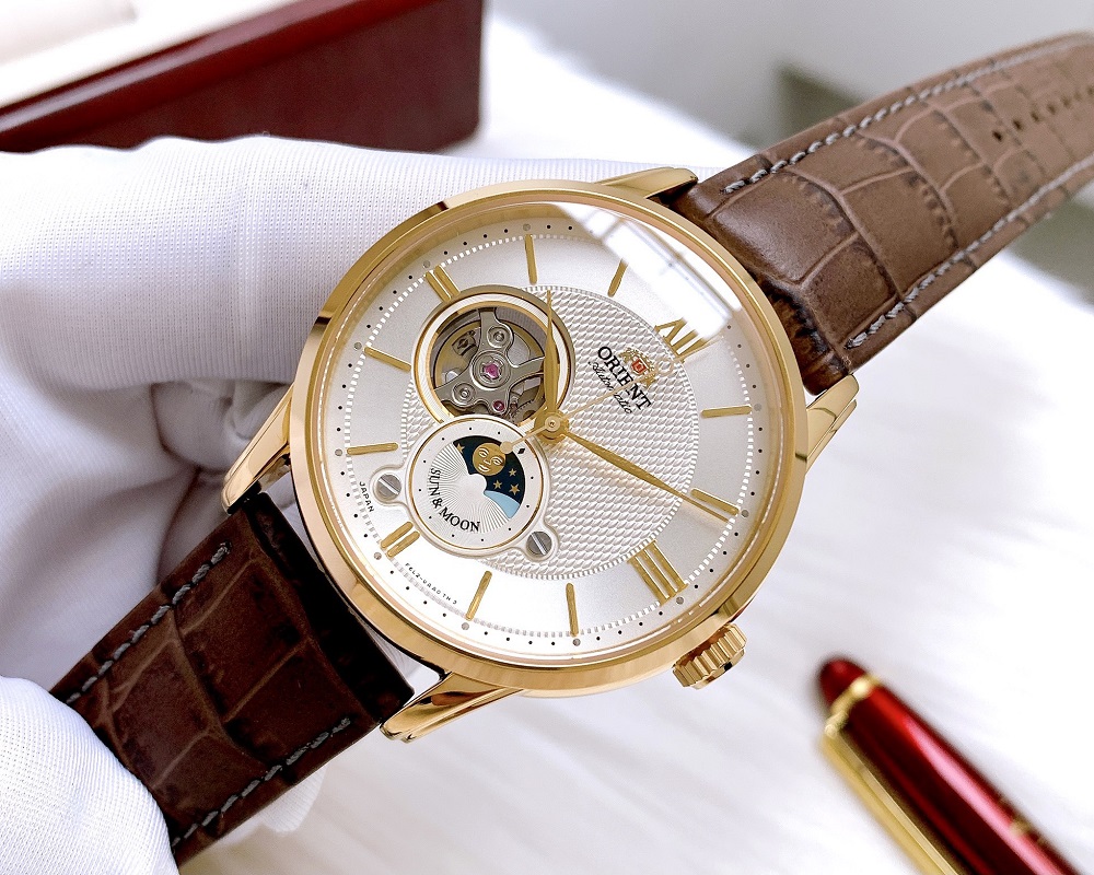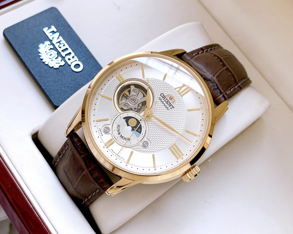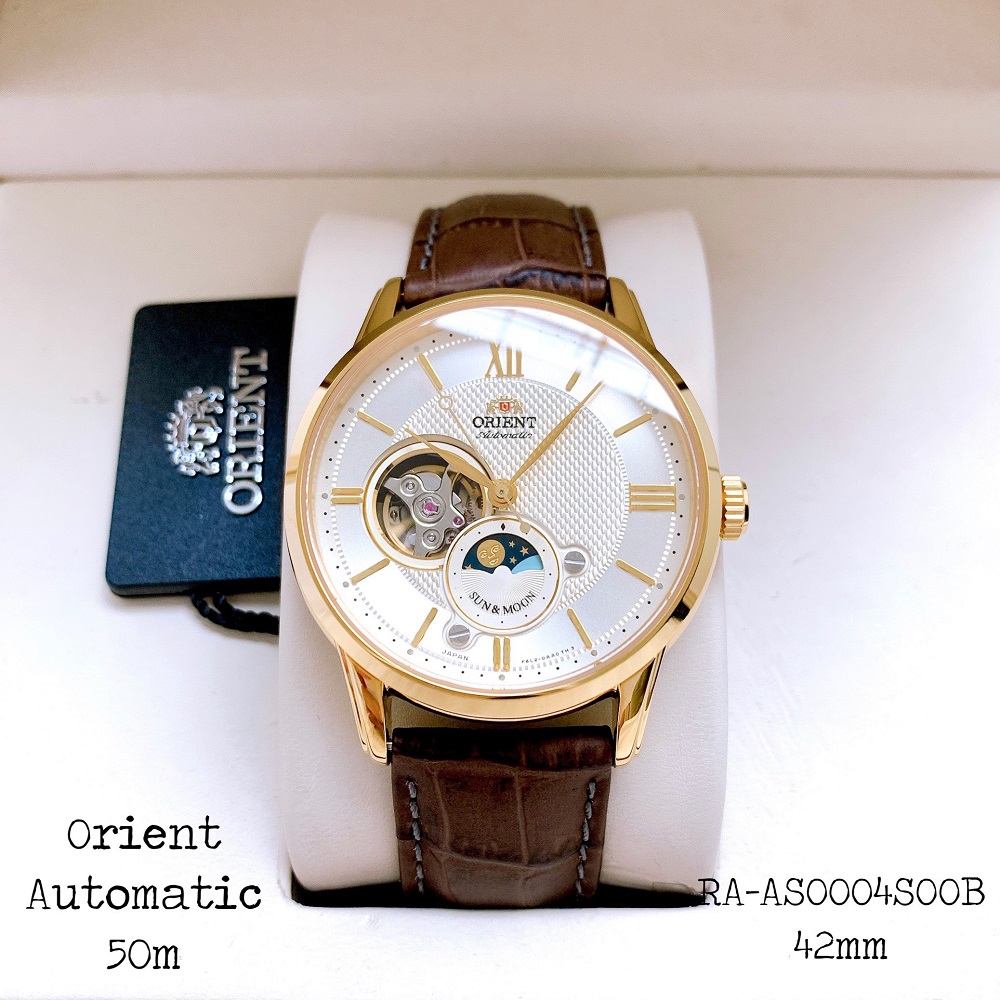 Đồng hồ nam ORIENT Sun & Moon GOLD AUTOMATIC RA-AS0004S00B là Sự kết hợp giữa Sun&Moon và Open Heart. Máy Automatic Calibre F6L24, 22 Jewels, đầy đủ tính năng lên cót tay và dừng kim giây