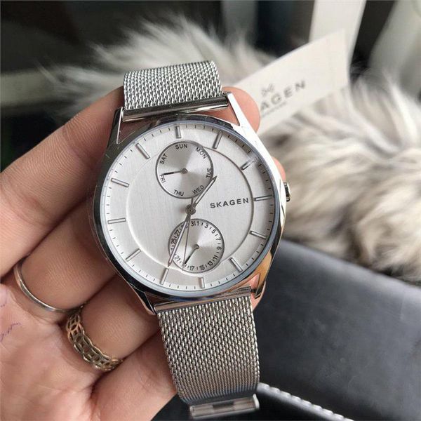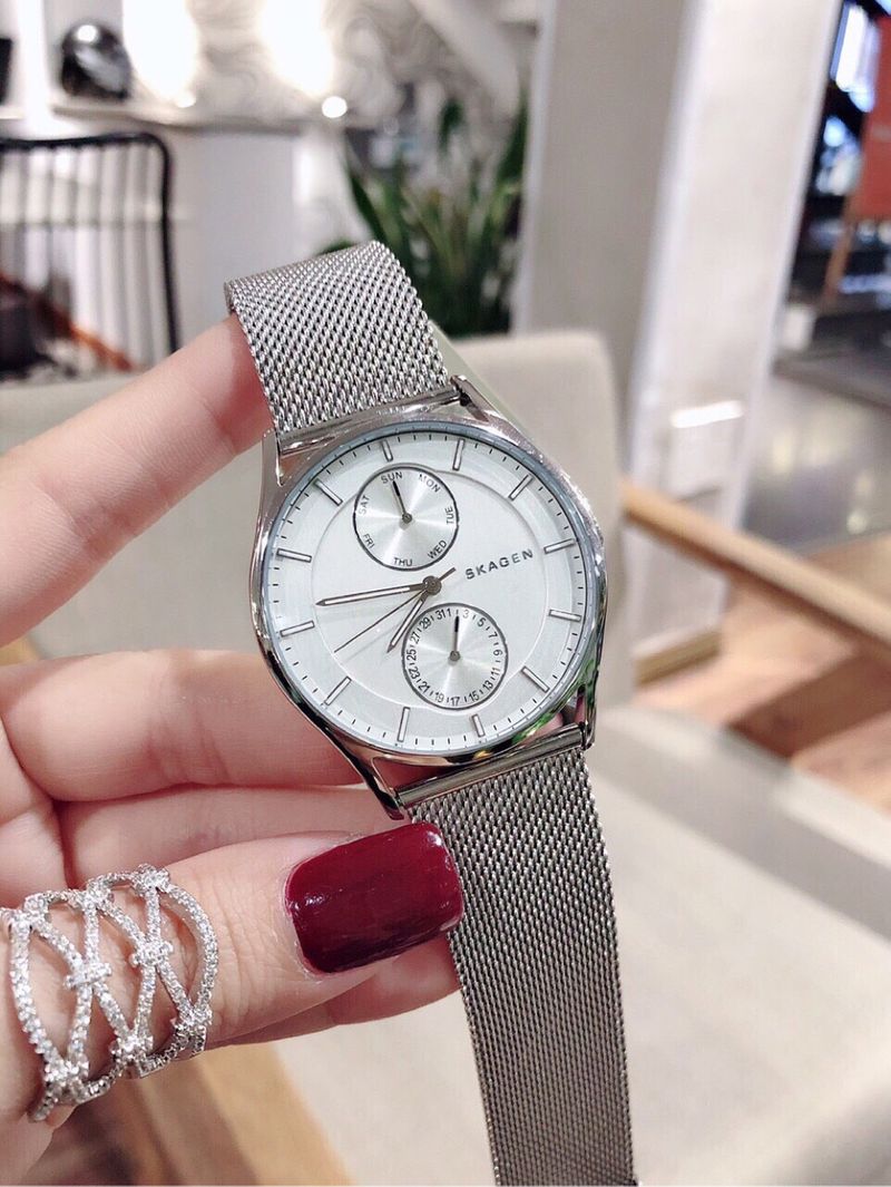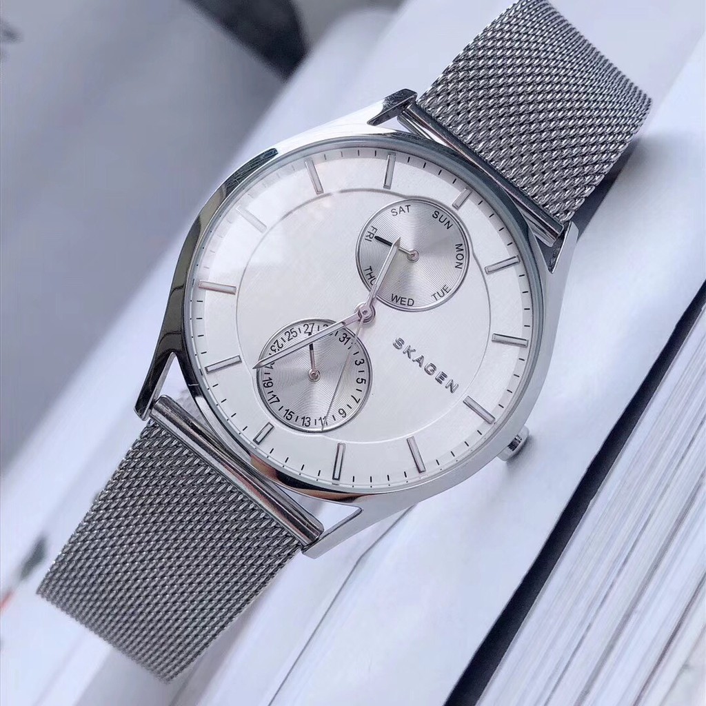Đồng hồ nam Skagen SKW1065 có thiết kế tổng thể đơn giản với dây màu bạc kèm mặt màu trắng sang trọng, 2 vòng lịch ngày và thứ nổi bật. Dây lưới ôm mặt tạo nên vẻ săn chắc cá tính cho phái mạnh